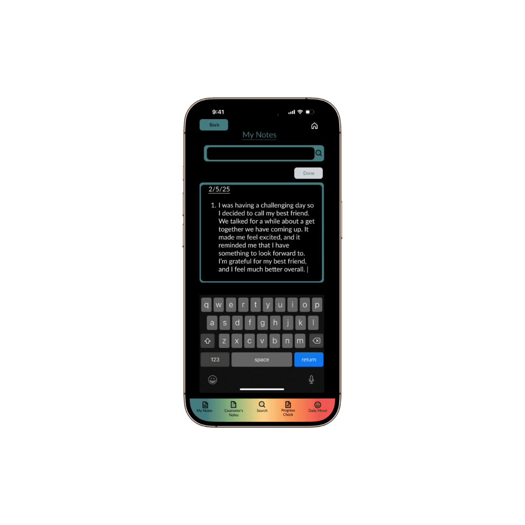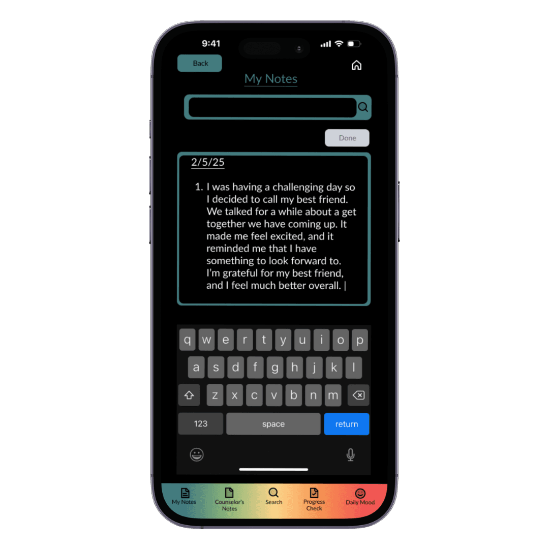 Write down all of your “a-ha” moments, important things you want to work on, coping skills you want to try, or just clear your head by getting your thoughts down on the app.