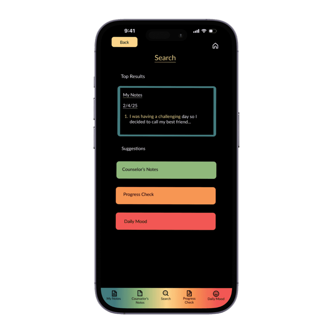 To maintain my user-centered approach, I returned to the users and tested the prototype with them in multiple rounds of usability testing to see what insights they had to share with me on the app. I learned about the app’s strengths, weaknesses, and even possible new features and notes sections that could be added. One of the users’ main pain points while navigating the prototype was the search notes feature. After adjusting the search red route in the prototype, there were less hesitations and misclicks by the users. Users had many helpful suggestions on the layout and design of the app which I used to redesign certain screens of the app. Overall, users were excited to start using the app for their counseling notes based on its simplicity and helpful features.