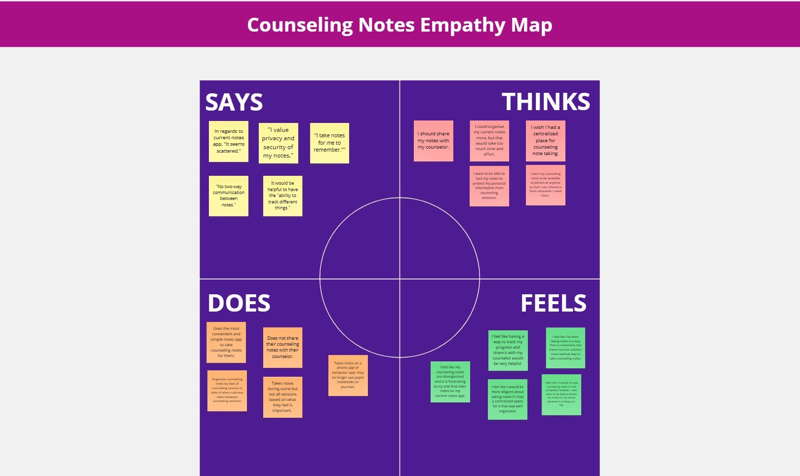There are many general note-taking apps that smartphone users can choose from; however, none of them are currently tailored to the counseling note-taking experience for people that attend counseling sessions to improve and maintain their mental health. Counseling Notes is an app that enables clients to keep well organized notes on their counseling sessions, helps clients keep track of their weekly goals and insights from their counselors, allows clients to compare their progress with their counselors’ view of their progress, and enables clients to track their daily moods.