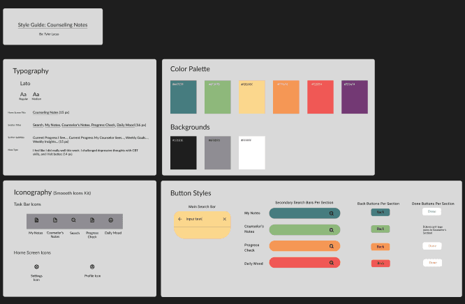 Creating a style guide allowed me to standardize the colors, icons, and fonts that I used while making the high fidelity mockups of the app so that I was using the same themes throughout the app to achieve design consistency.